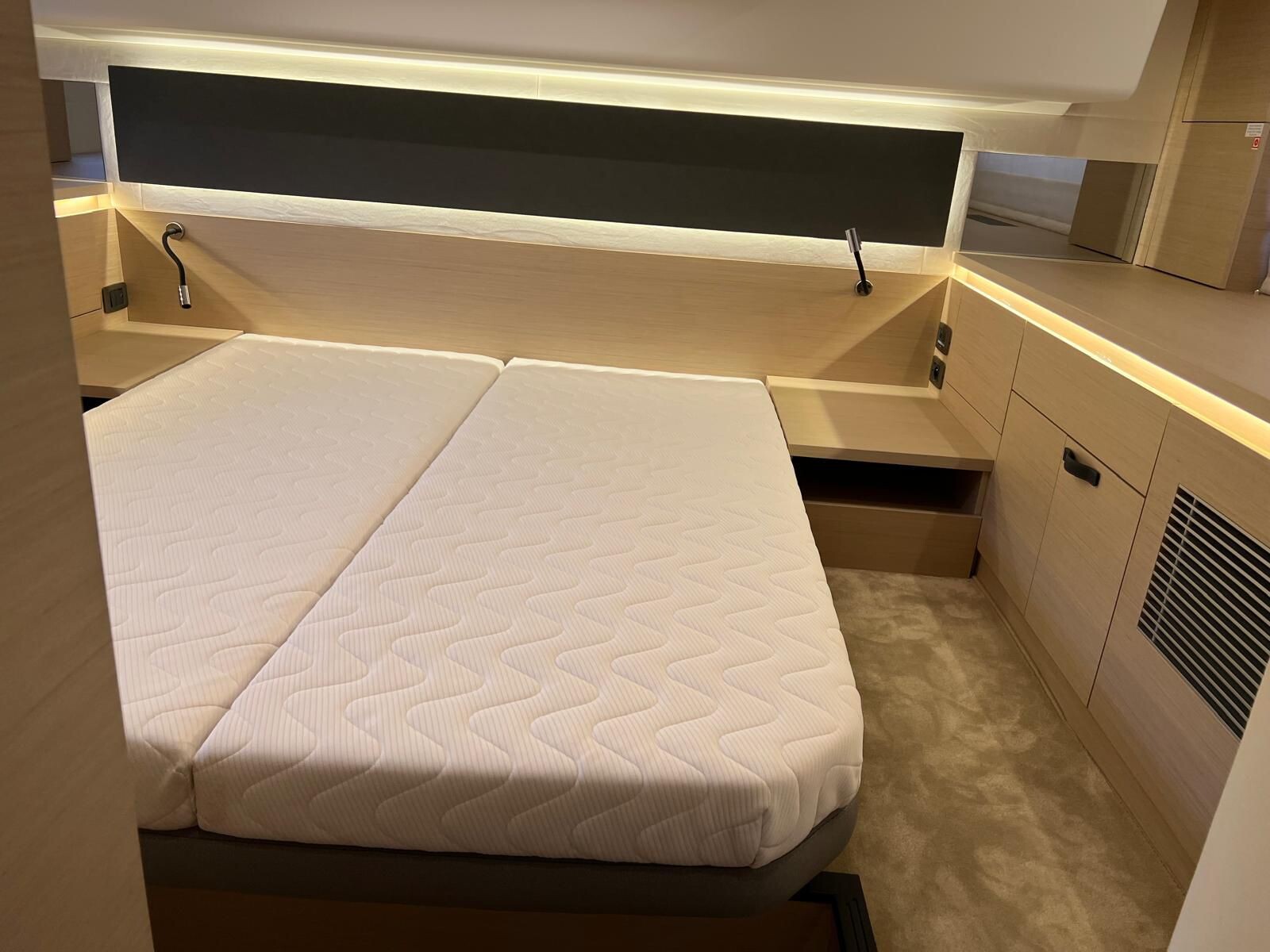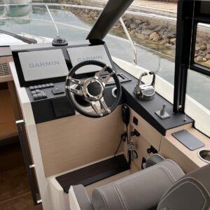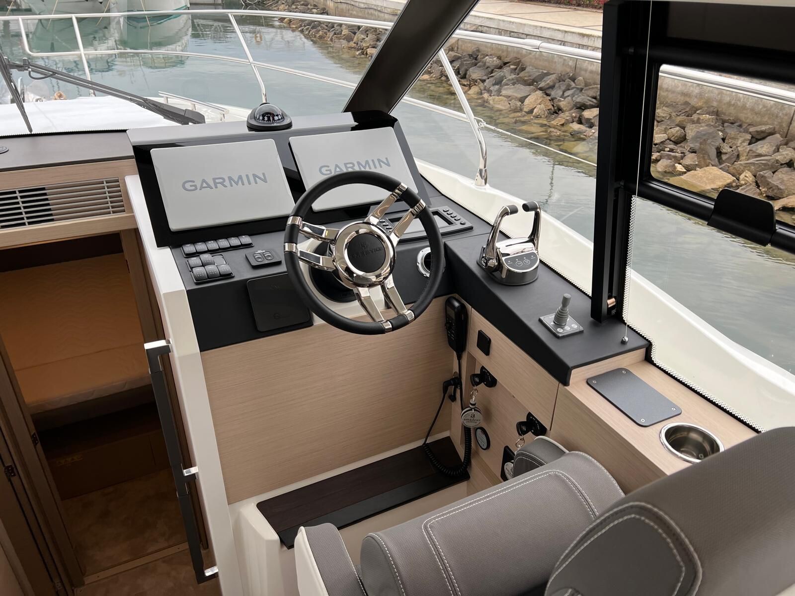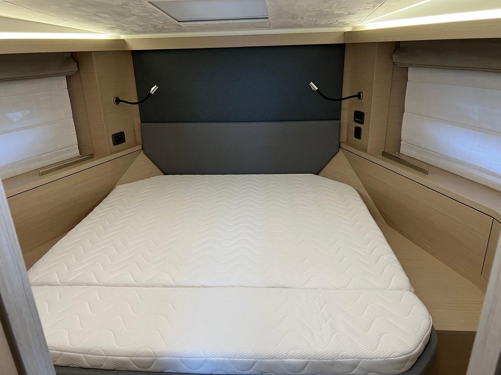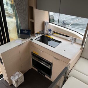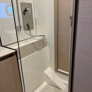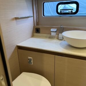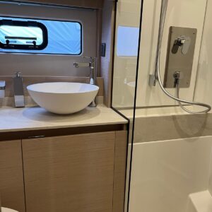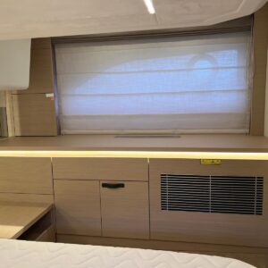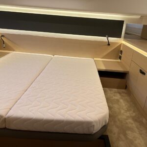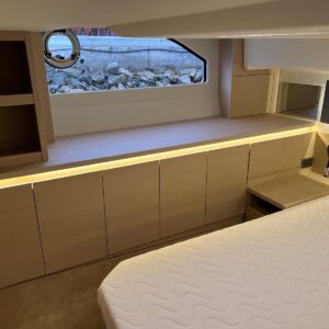 Comando Joystick Wireless DOCKMATE Twist – nuovo, Elica di prua 140 kgf, generatore 8,5 kw, con insonorizzazione, aria condizionata, passerella idraulica, trim flap elettrici, interni rovere bianco, pavmento in parquet Wengé spazzolato per ingresso e salone, Moquette in 2 cabine, frigorifero in acciaio inox con 2 cassetti, batteria extra 115A, panca pozzetto, bitte aggiuntive in acciaio inox sullo specchio di poppa, comandi verricello e contacatena alla timoneria, pozzetto e plancetta in teak, finestra apribile a dritta, piano cottura in vtrc, microonde/grill, sistema di lavaggio elettrico del ponte in pozzetto e gavone dell’ancora con pompa separata, presa acqua da banchina, vhf, pilota automatico – Interfaccia Cummins, plotter 12″, audio BOWERS & WILKINS, zanzariere, etc. PARI AL NUOVO