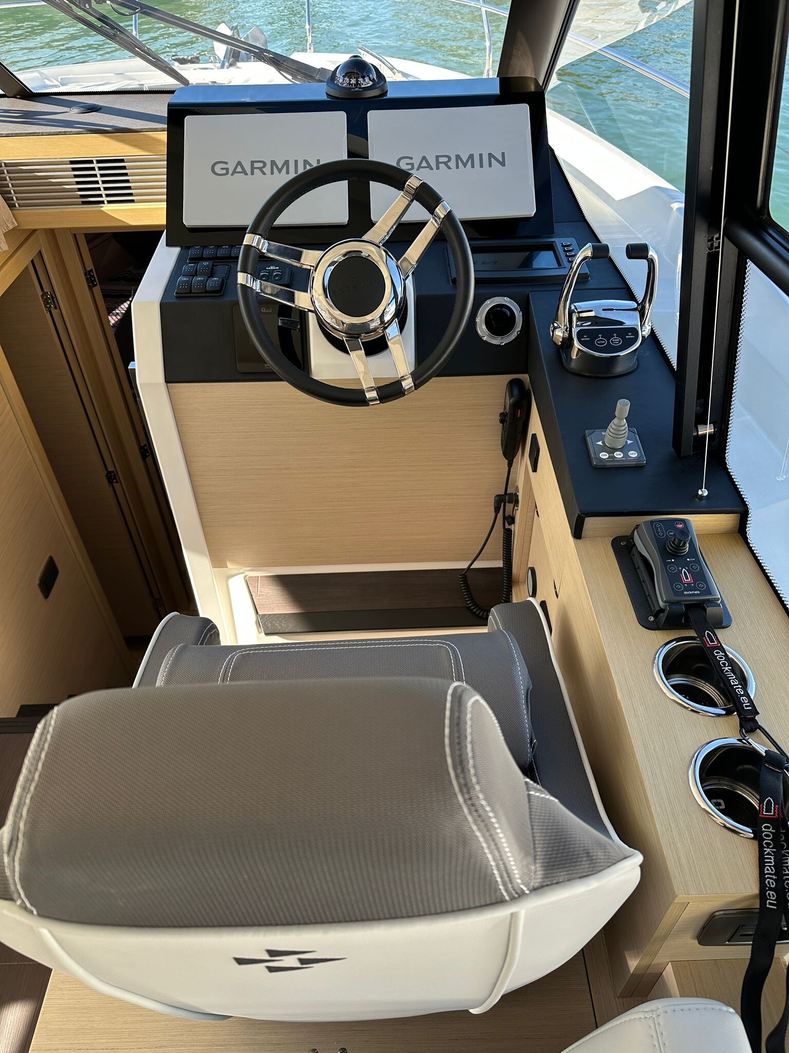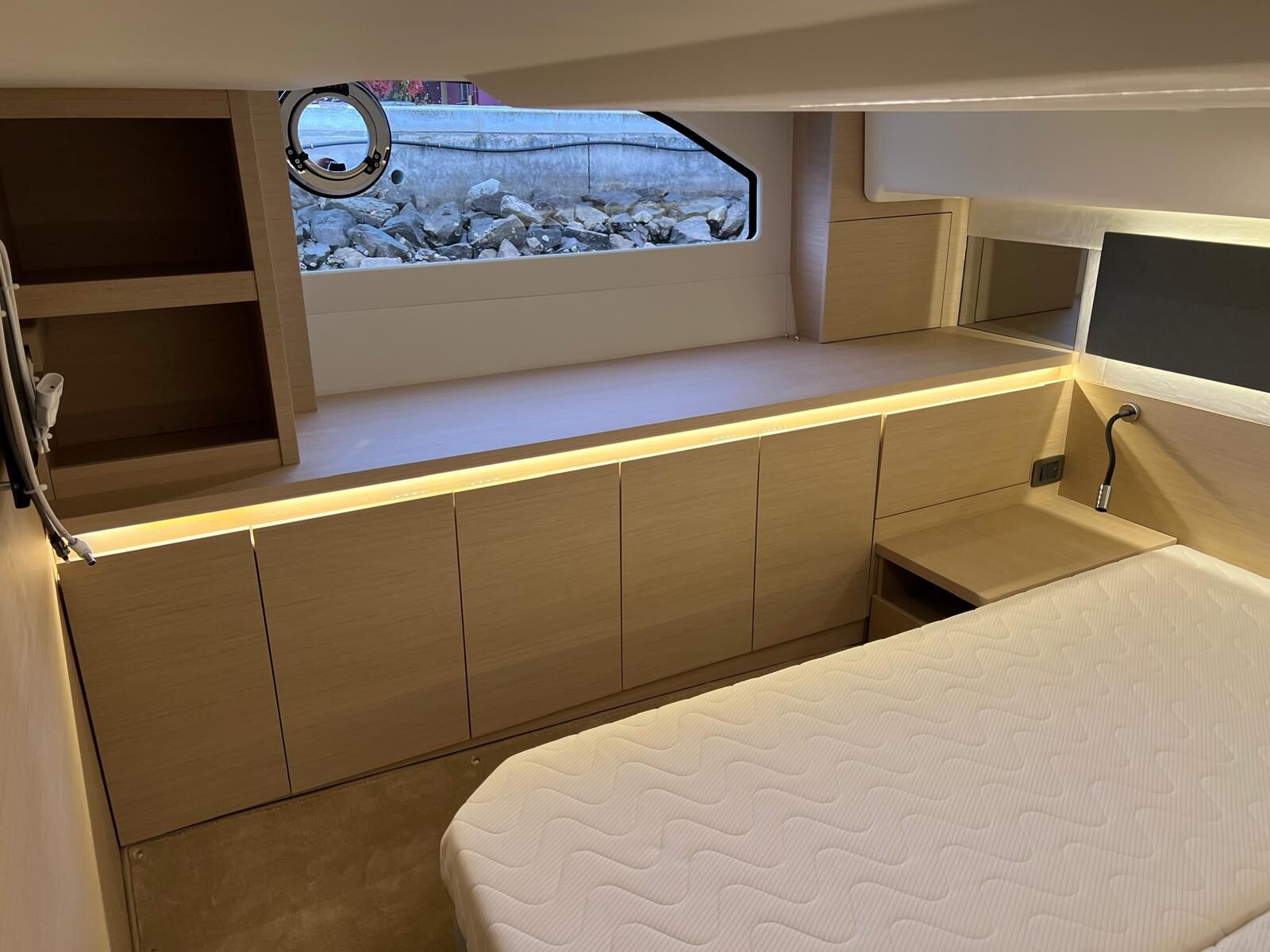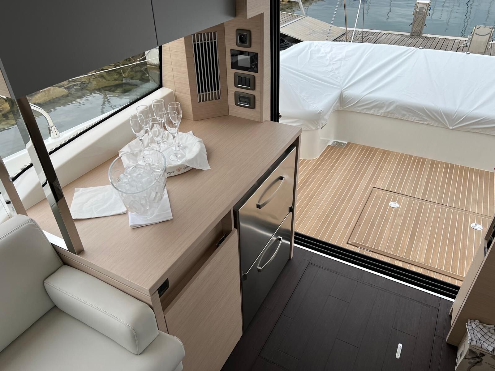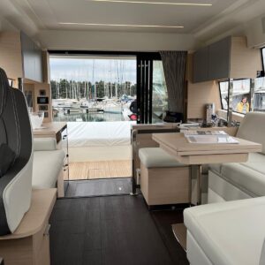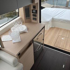 Comando Joystick Wireless DOCKMATE Twist – nuovo, Elica di prua 140 kgf, generatore 8,5 kw, con insonorizzazione, aria condizionata, passerella idraulica, trim flap elettrici, interni rovere bianco, pavmento in parquet Wengé spazzolato per ingresso e salone, Moquette in 2 cabine, frigorifero in acciaio inox con 2 cassetti, batteria extra 115A, panca pozzetto, bitte aggiuntive in acciaio inox sullo specchio di poppa, comandi verricello e contacatena alla timoneria, pozzetto e plancetta in teak, finestra apribile a dritta, piano cottura in vtrc, microonde/grill, sistema di lavaggio elettrico del ponte in pozzetto e gavone dell’ancora con pompa separata, presa acqua da banchina, vhf, pilota automatico – Interfaccia Cummins, plotter 12″, audio BOWERS & WILKINS, zanzariere, etc. PARI AL NUOVO